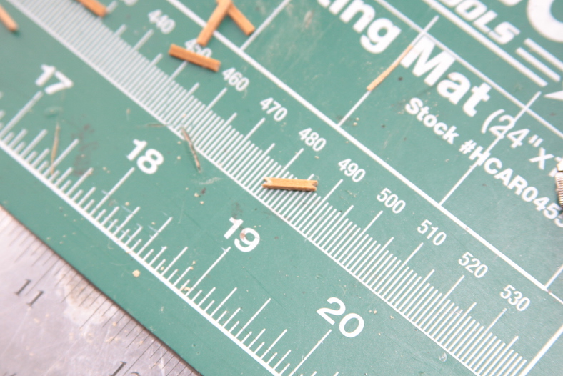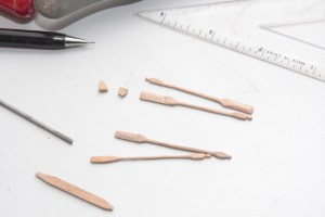 Finishing the launches meant carving out some oars. Also pretty straightforward, I created an assembly line of 5mm x 1mm strips, shaved off the edges using a mini belt sander, then sanded the oars down. These are the rough cuts prior to the detail sanding and staining.
