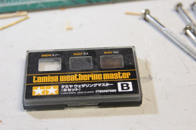 The trick is to add the fake soot and/or rust to a slightly damp product. In my case, I sprayed each piece with a thin coat of polyurethane then added the weathering product. Additionally, I painted the brass fittings that would not patina properly, then coated the entire fixture with the soot just before the paint dried entirely.