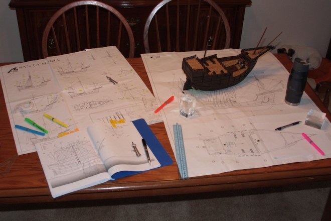 To my surprise, the rigging plans supplied in the kit were quite accurate when compared to Pastor’s rigging. There were however extensive differences between the two when it came to belaying the rigging to the deck. Using the plans supplied, Pastor’s work, Mondfeld’s “Historic Ship Models” and “Vanguard of Empire” by Roger Smith (which contains some of Columbus’ actual notes) I put together my own ‘best guess’ of the ship’s rigging. I then drafted a mockup-up of the ship’s deck and where cleats, sheaves, rails, and deck rings will be located to facilitate the rigging.