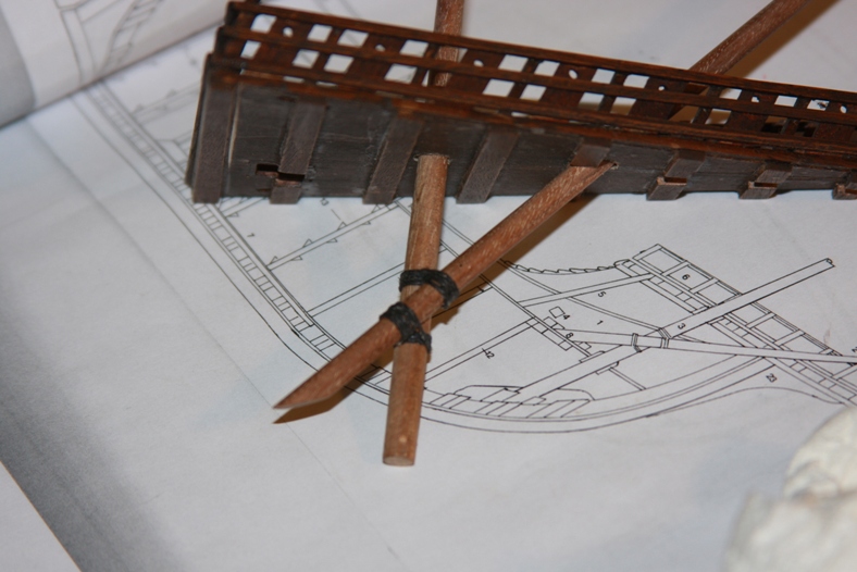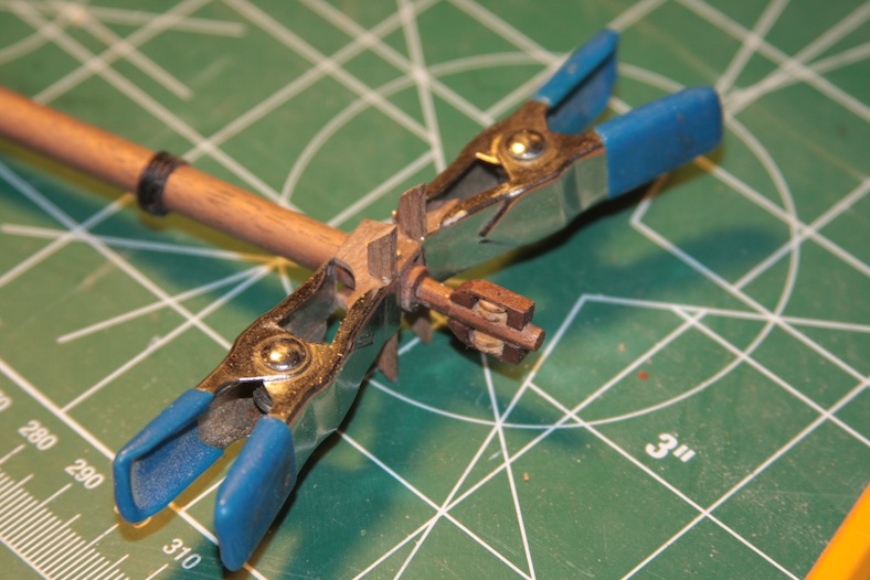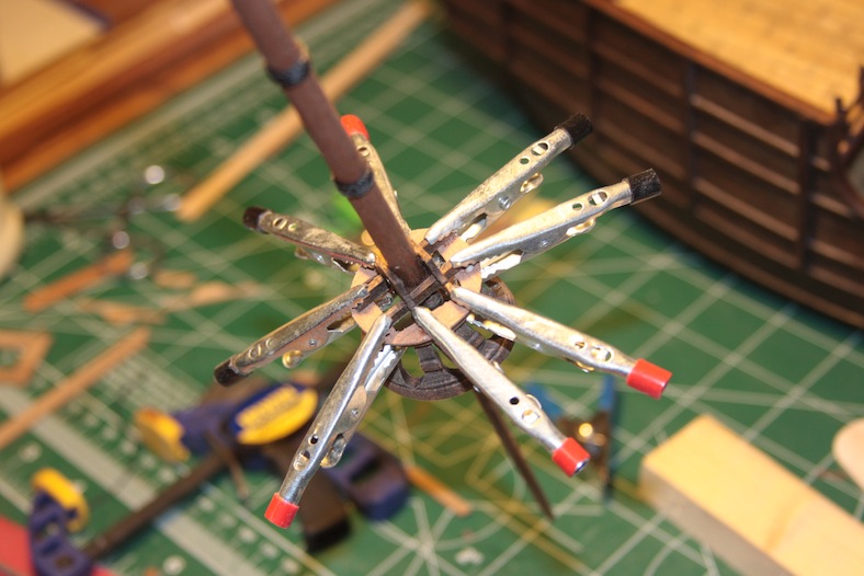 At any rate, the strips are cut and mitre’d on the edges so they fit together adequately around the mast. Finally they are glued, then the ropes are added and tied as per Mondfeld’s “Historic Ship Models” in which the ends are tucked in to the back of the mast.