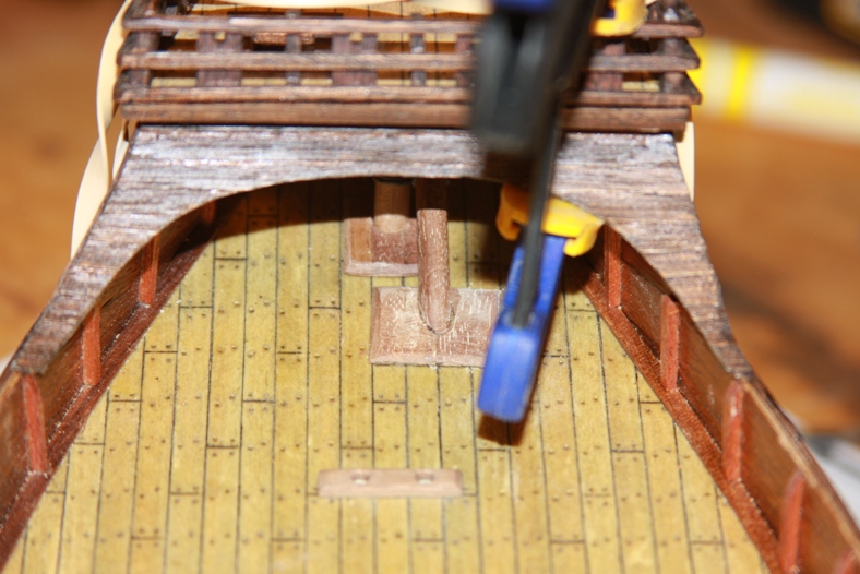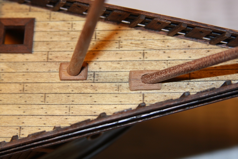 Rather than just gluing each stanchion to the deck (which would be terribly unstable), I followed the same protocol as the bow and fitted the poles with a pin to hold them in place.