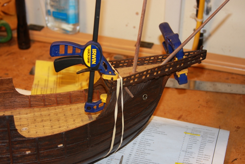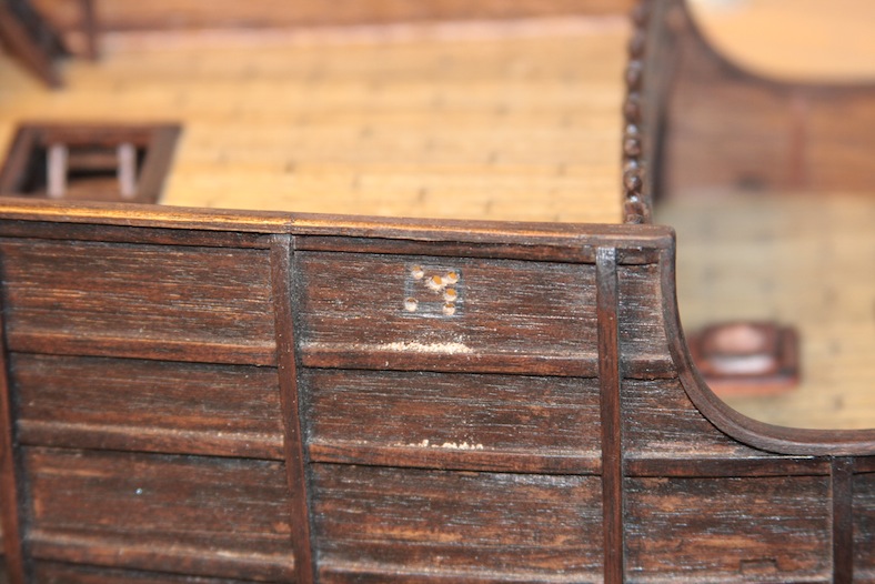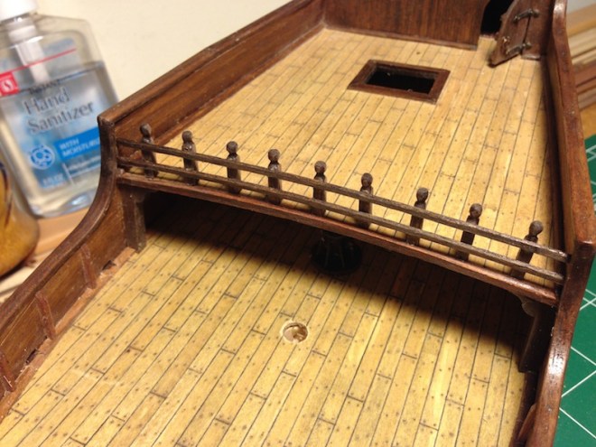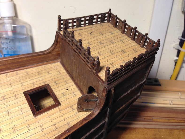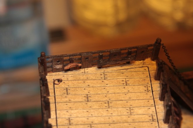 A very tedious task that I had been putting off was the deck railings. Like the bow of the ship, the poop deck railing consists of stanchions, railings, then wooden slats.