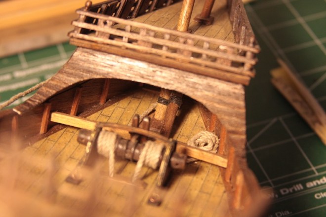 The final product with the head beam and windlass in place looked pretty good. It all makes me realize just how little space the sailors had to run around and actually sail the ship.