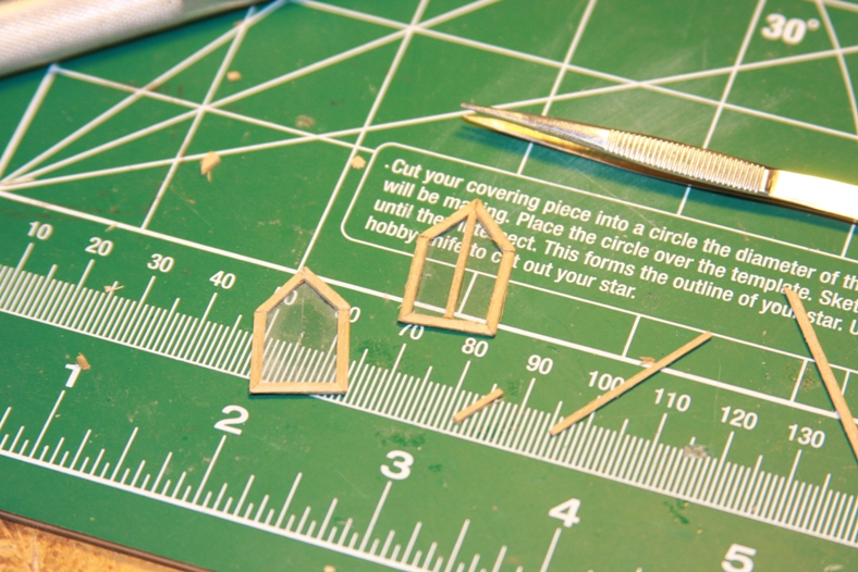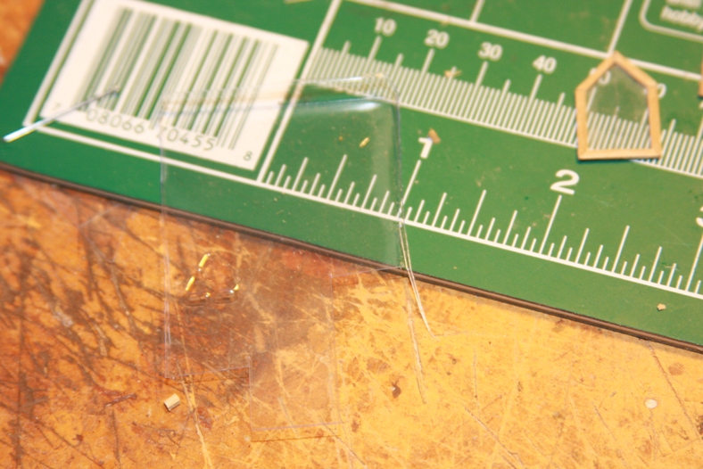 I framed the windows with 2mm X 2mm strips cut and glued. Then I covered them with “glass” made from the plastic container that held some screws. I scored the glass carefully with an older, dull Xacto blade being careful not to pierce all the way through the glass.