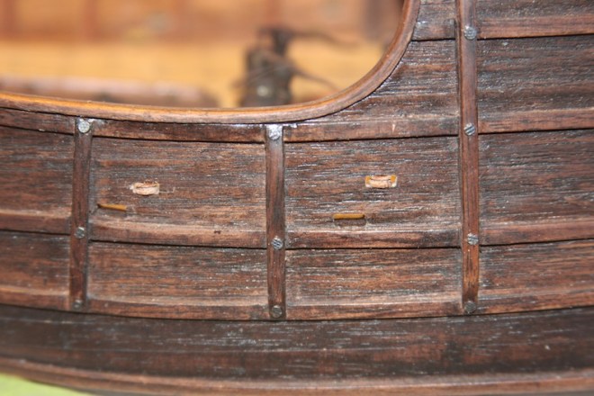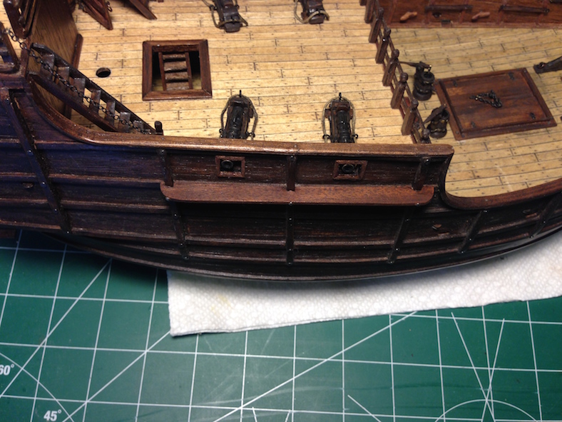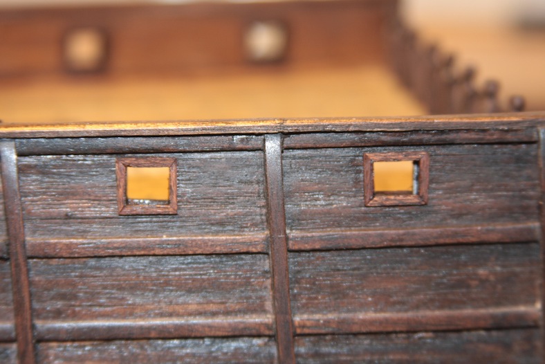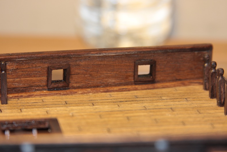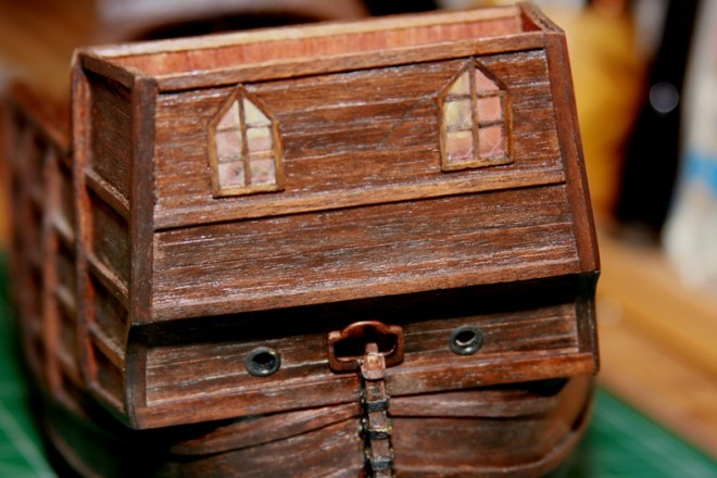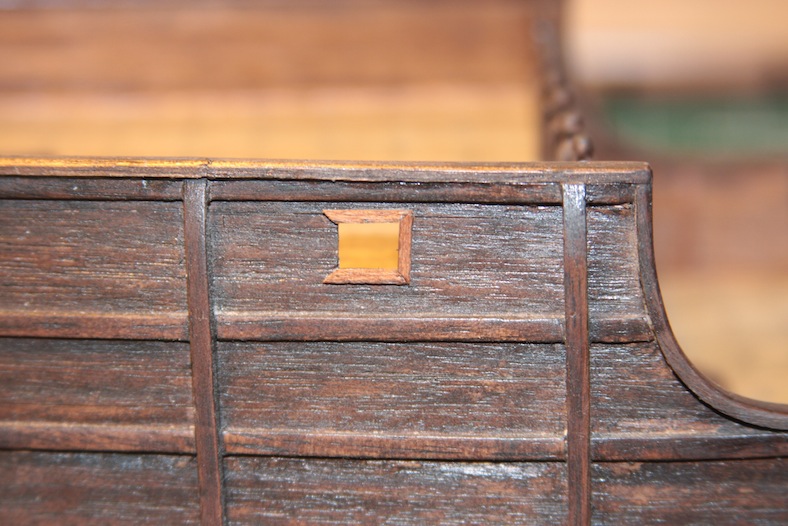 I then stained and mounted the windows to the rear of the captain’s cabin trying my best to match the coloring as closely as possible on the outside, while maintaining a mahogany color on the inside of the cabin, a location which would most likely have been more decorative.