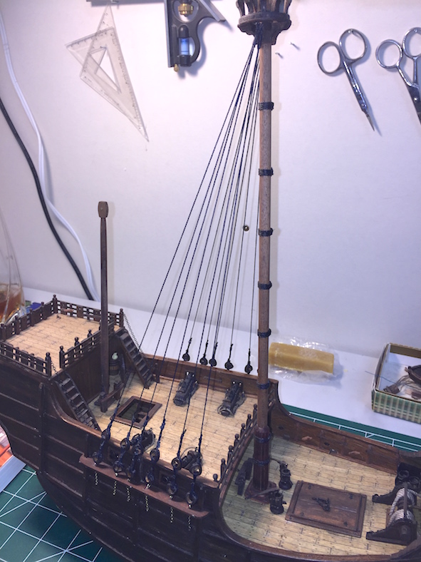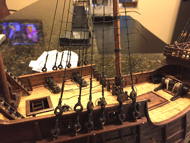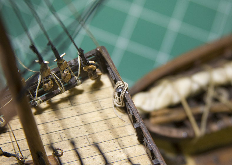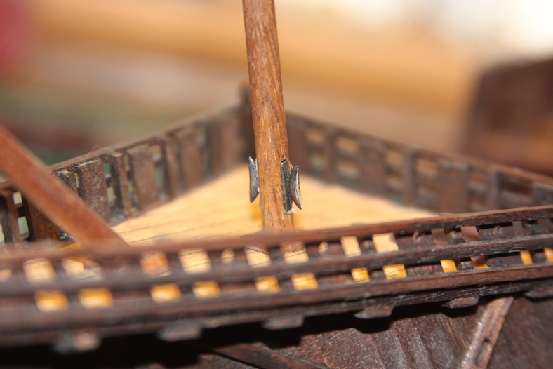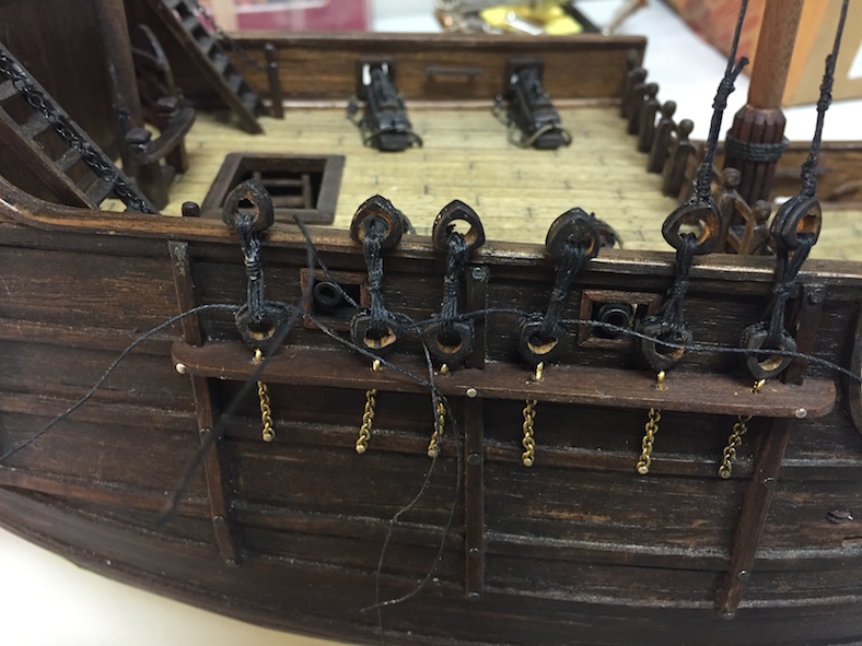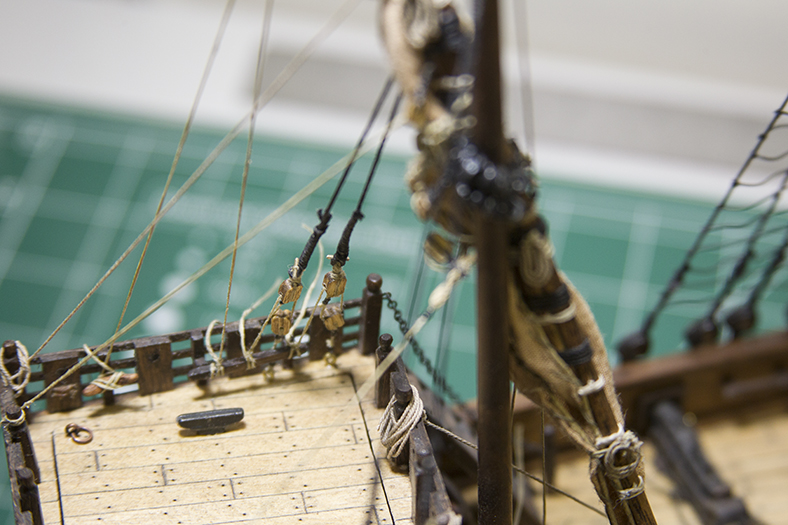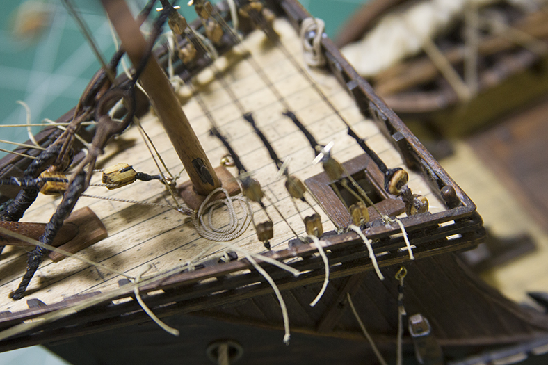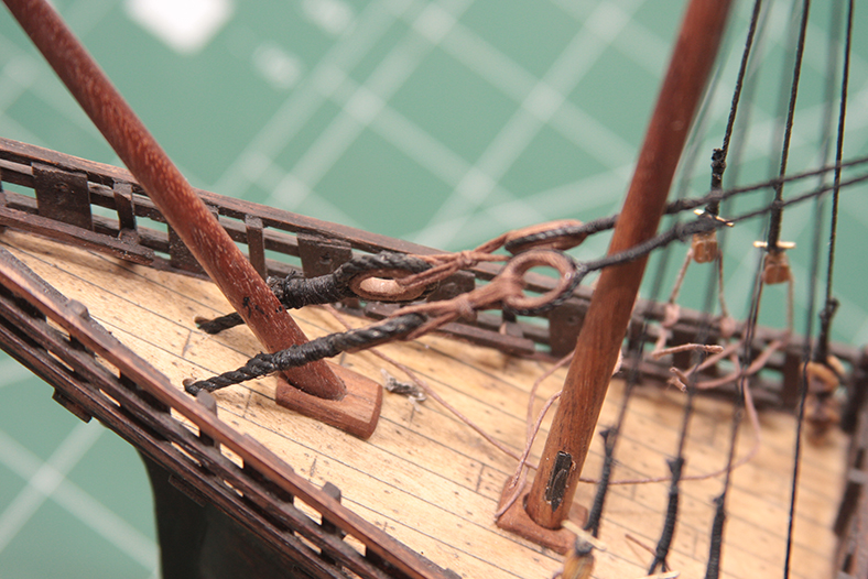 The rear shrouds (the standing rigging which hold the mast to the ship) are attached to the deck with eyelets. This became rather challenging when it came to keeping them far enough out of the way to allow the poop deck to be raised and lowered.