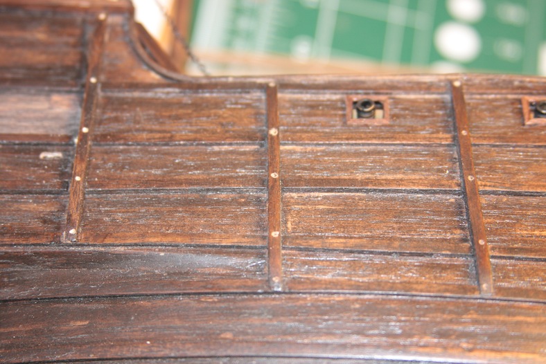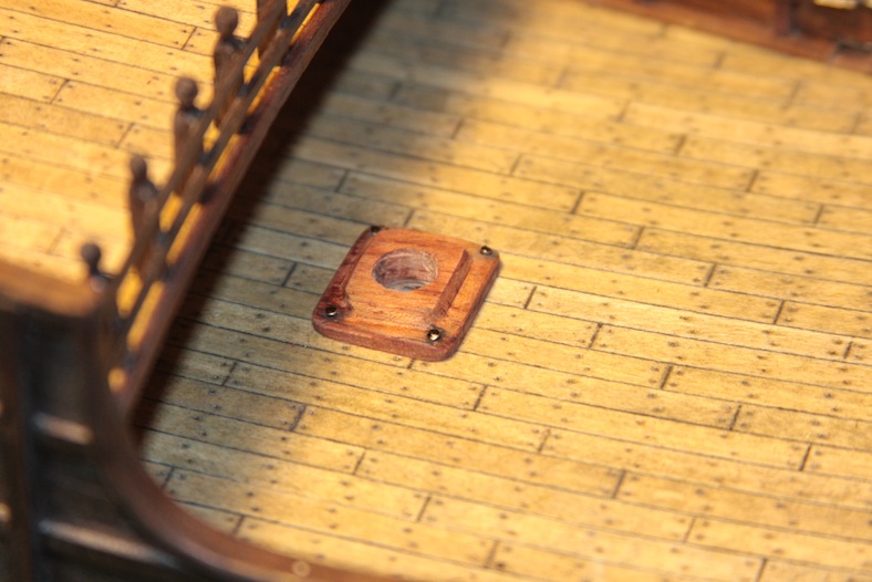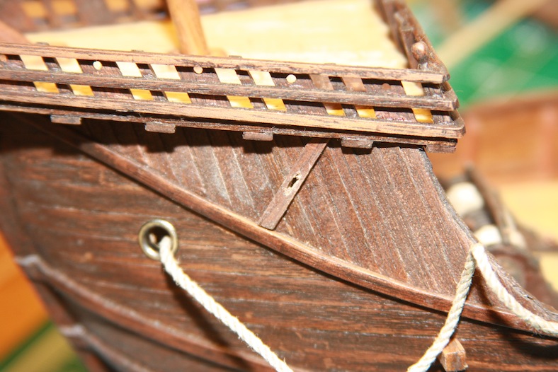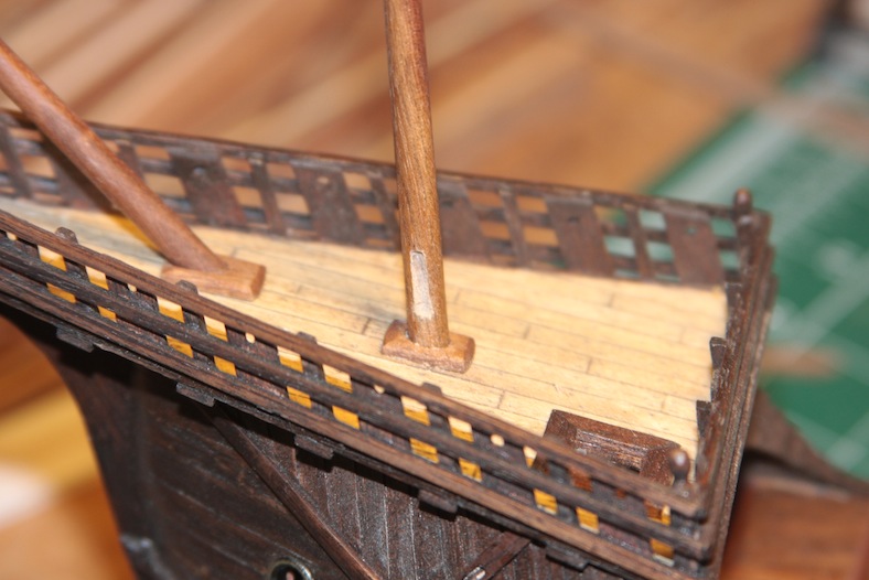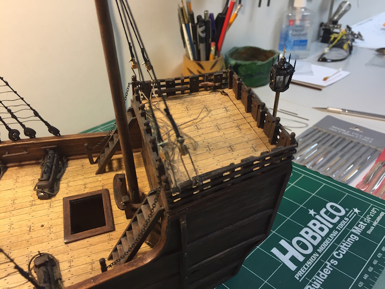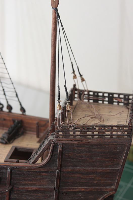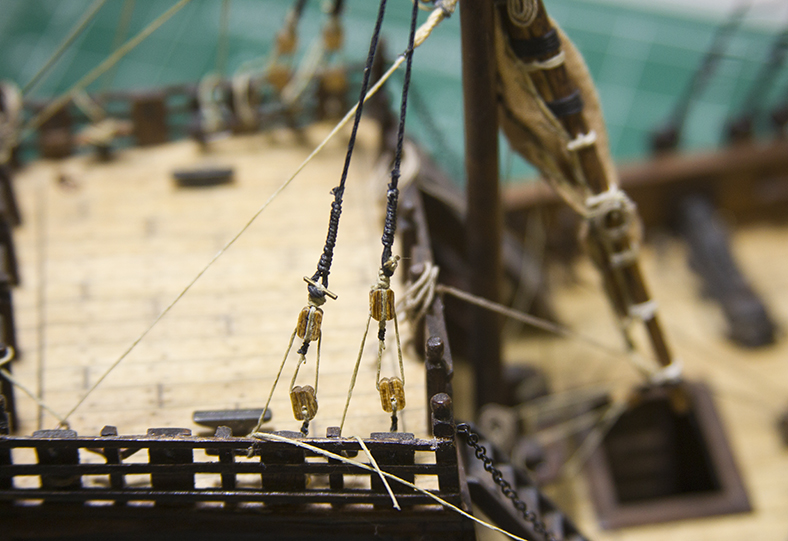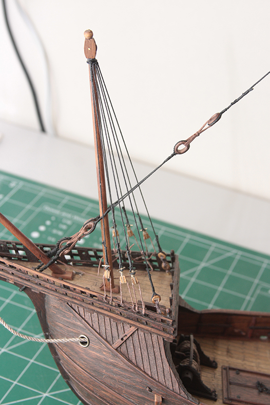 The rear shrouds (the standing rigging which hold the mast to the ship) are attached to the deck with eyelets. This became rather challenging when it came to keeping them far enough out of the way to allow the poop deck to be raised and lowered.