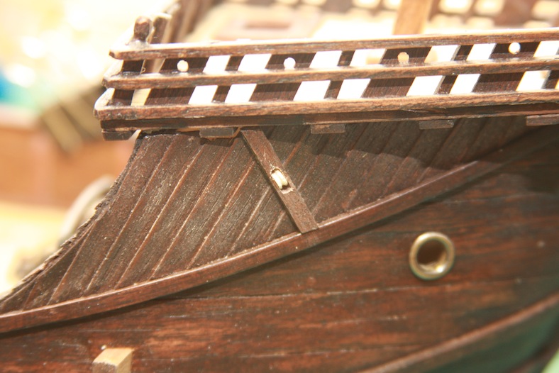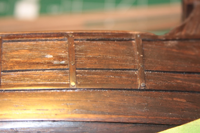 The outside of the gunports are framed with thin strips of mahogany that is mitre cut and mounted. In these cases I used “super” glue since the pieces are so delicate.