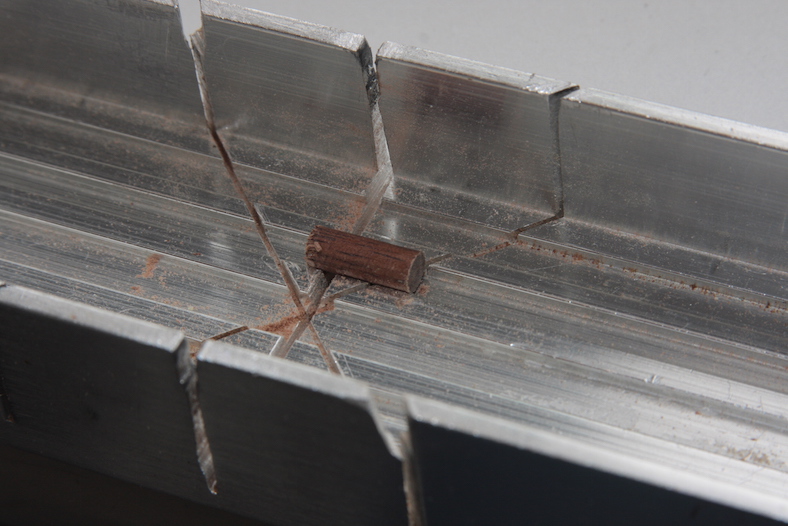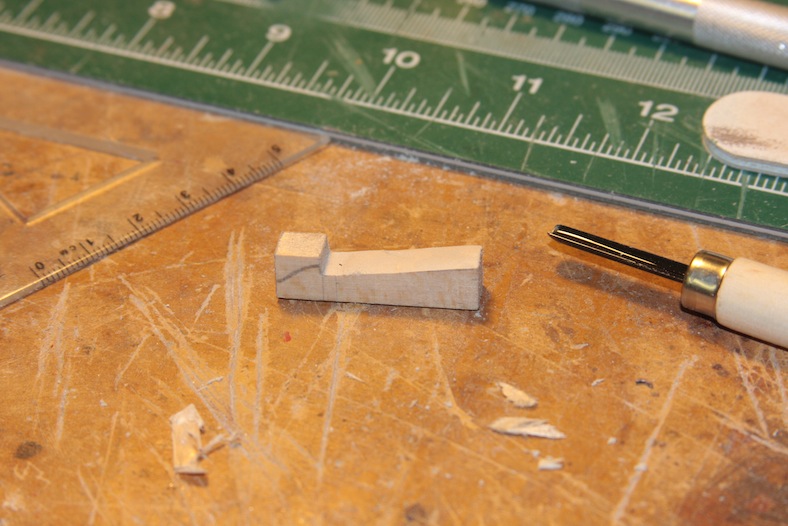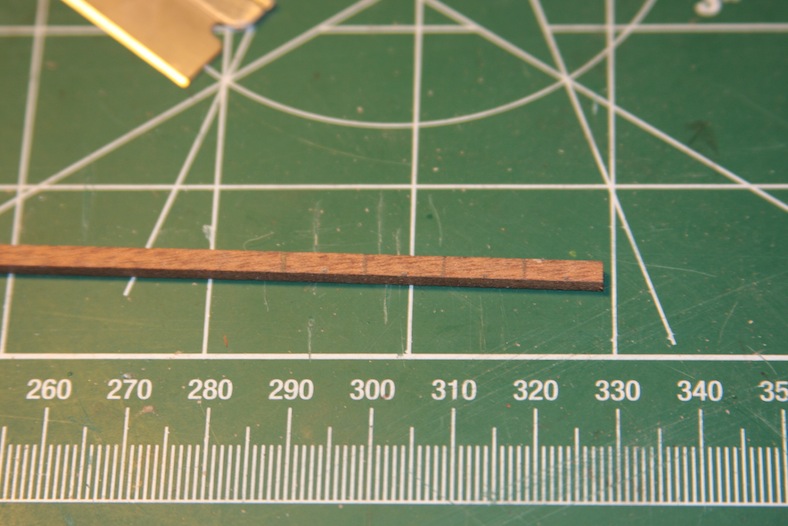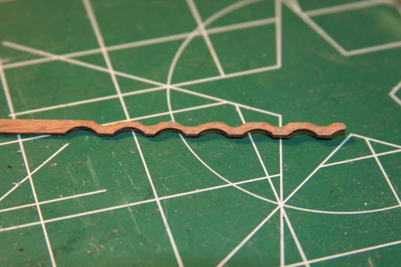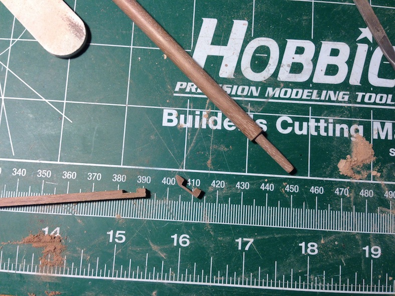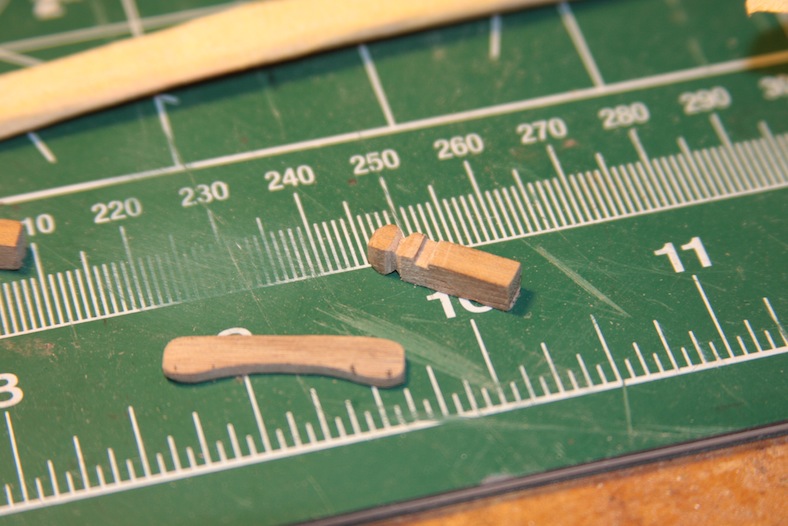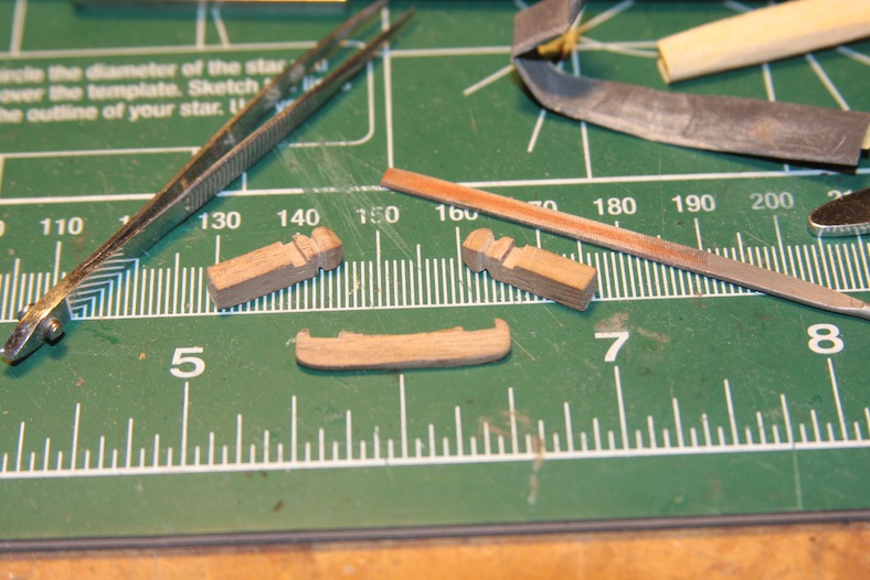 The new rail is the built essentially the same as the previous rail and consists of two 4mm x 4mm beveled stanchions and a 5mm x 1 mm walnut piece shaped and notched.