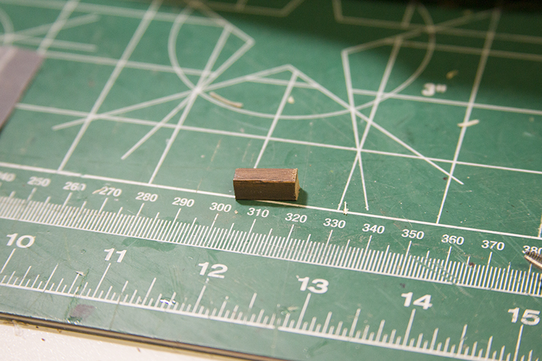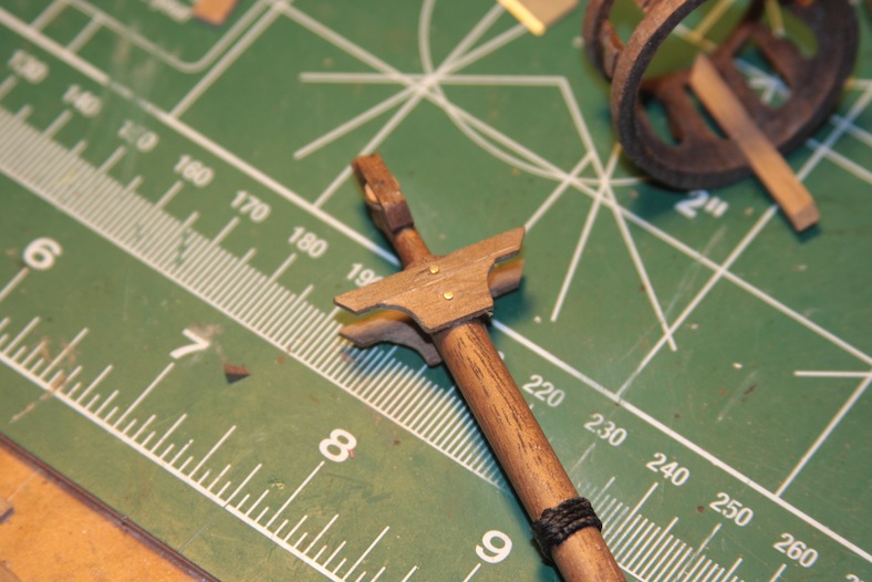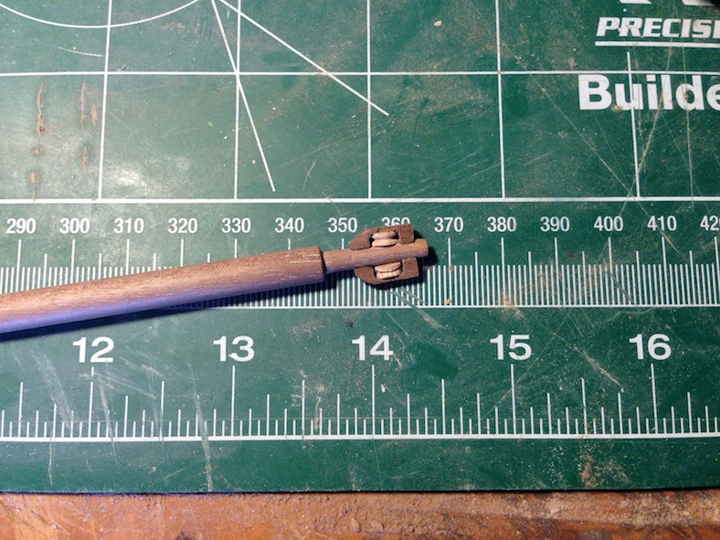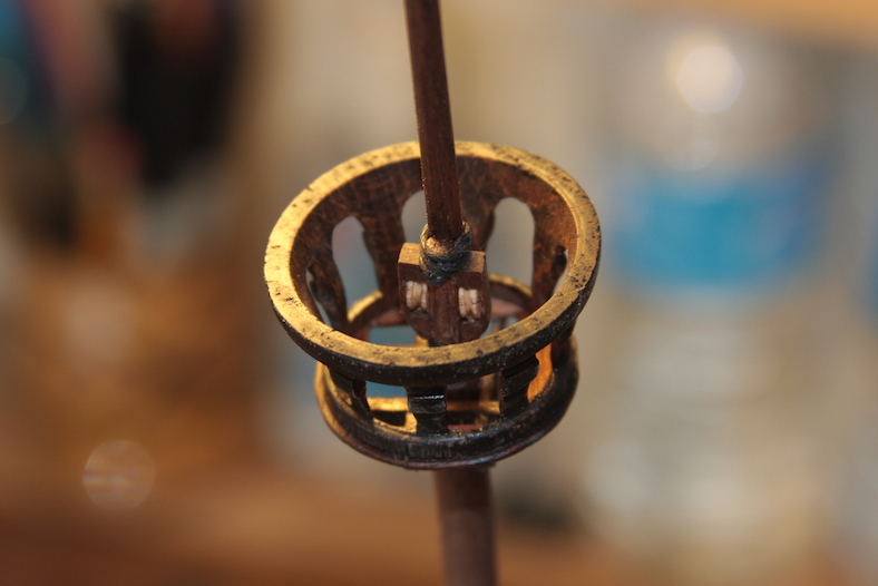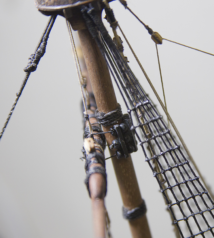 The sheave block is made from a piece of walnut, drilled and filed to create an opening. The opening is filled with the circular “pulley” cut from a leftover walnut dowel. The piece is sanded down to fit, placed into the block’s opening, and secured with a brass rod through the center of the entire piece. The sheave block is then secured to the top of the mizzen and fore masts with glue and a pin.