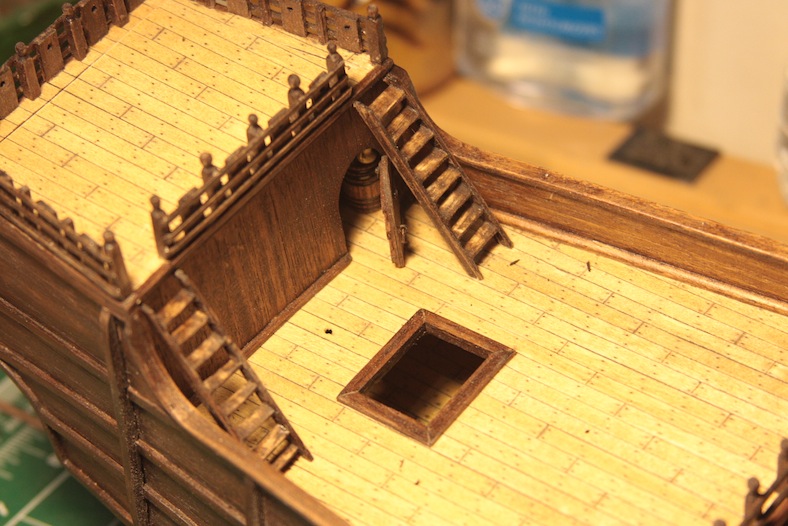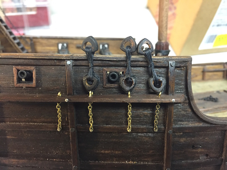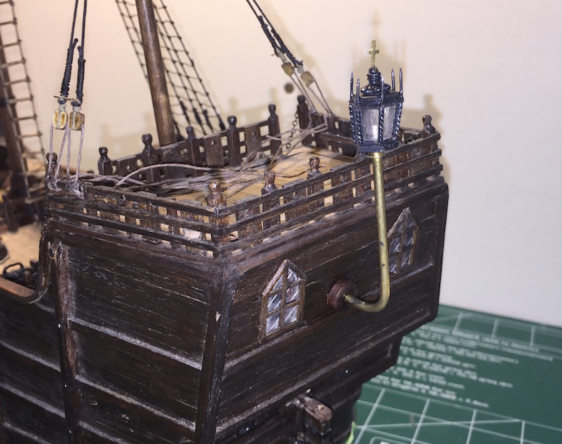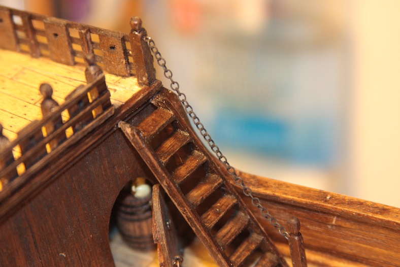 Although some reference material shows only one set of steps from the poop deck, Xavier Pastor’s reference shows two ladders. The final detail to the ladder is the chain guide running from the top stanchion to the bottom stanchion.