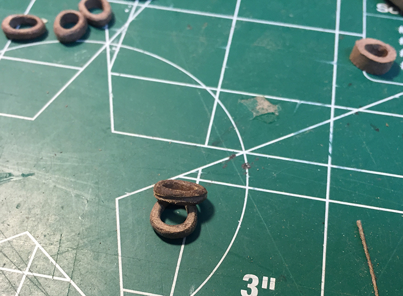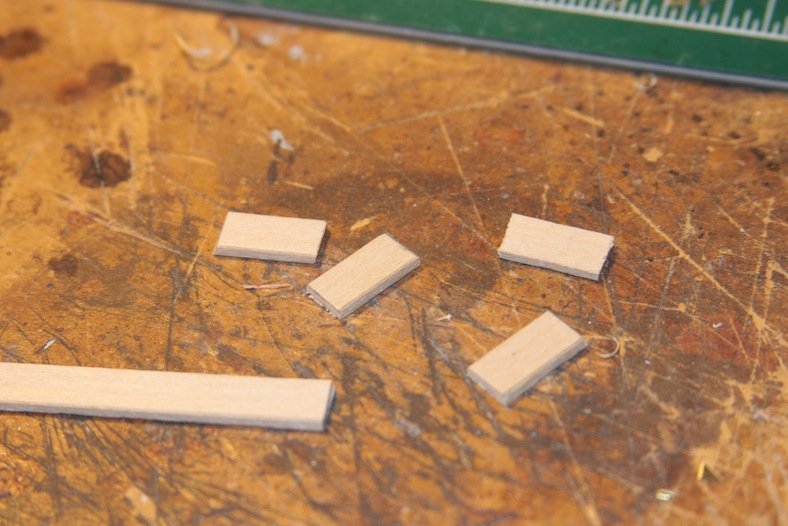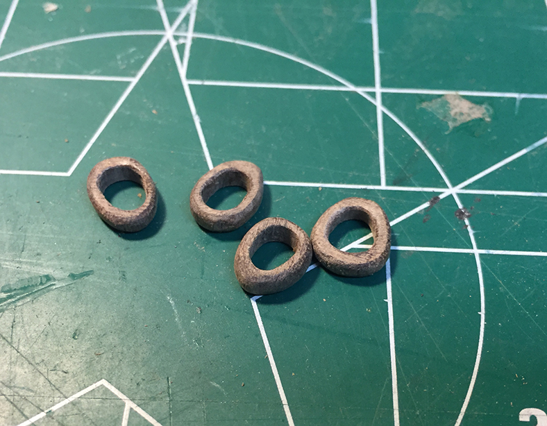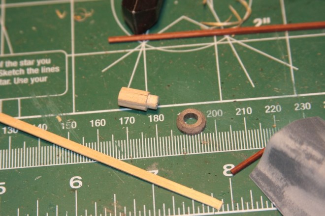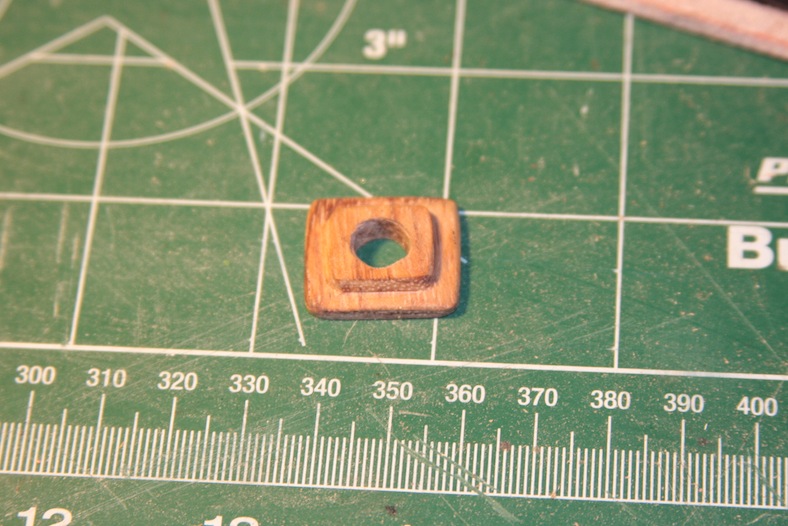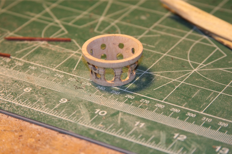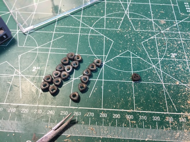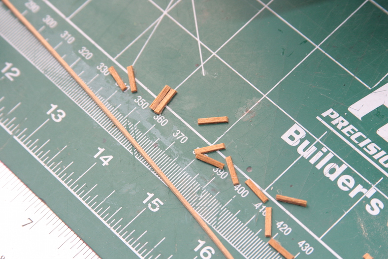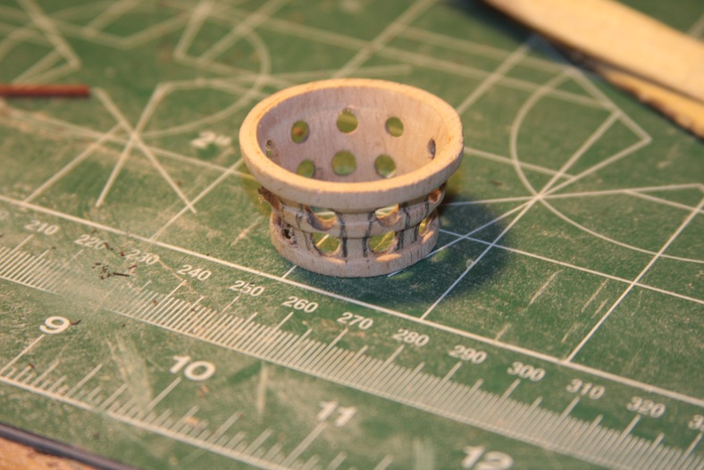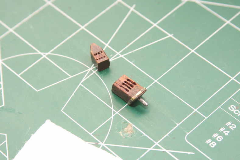 Step one was to create open blocks to remain consistent with the ratlines, etc. I used a 12mm dowel, cut off the ends and drilled them out.