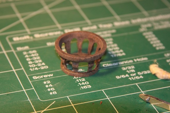 The main mast of course houses the crow’s nest. The crow’s nest supplied is a solid wall, poorly molded version. At first I started rebuilding the entire thing from scratch, then realized that I could probably just refit the one supplied.