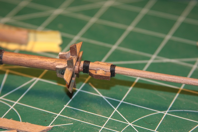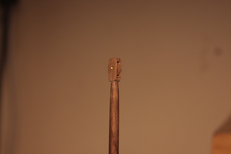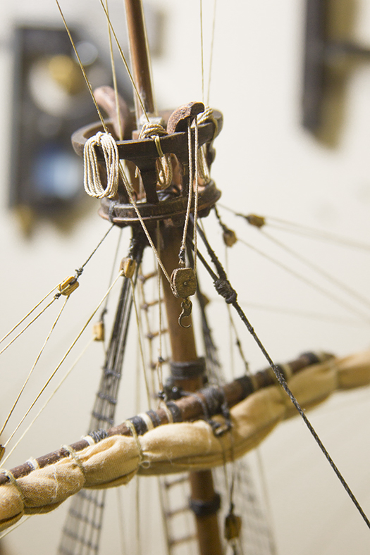 The important aspect of the topmast is the rounded sanding at the base to ensure it fits snug against the main mast while still accommodating the double sheave block after it is tied together. The final steps are to stain and/or tung oil the pieces to make them meld together while still showing the details with different grains of wood.