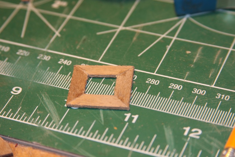 The next step is to decide on the base mount for the masts. The AL kit supplies circular, brass coated fittings that I think may be pewter. They not only look pretty cheap, but they’re not very well made. I prefer square mast bases anyway, so I built my own and beveled them.