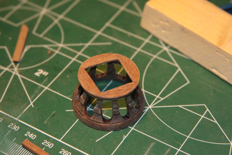 The base of the crow’s nest is simply four mitre’d 5mm walnut pieces that are rounded and fitted to size. The entire thing sits on your typical criss-cross structure that will also provide a base for the topmast. Getting these pieces to all tie together nicely required a fair amount of clamps.