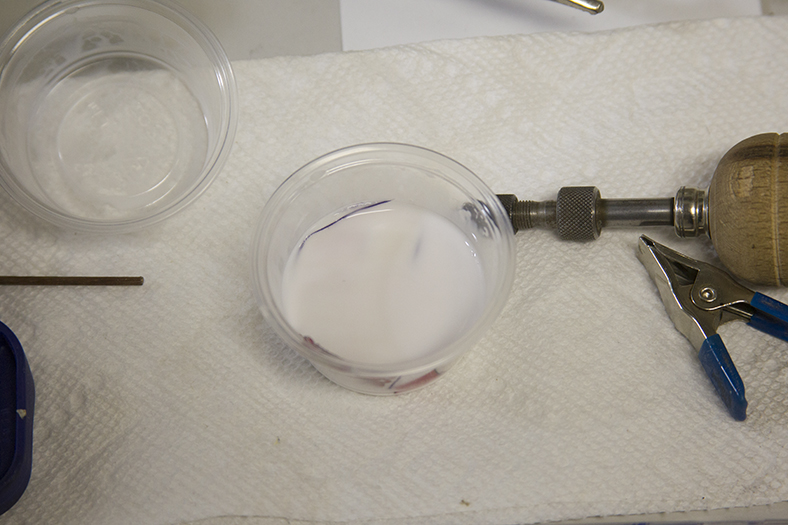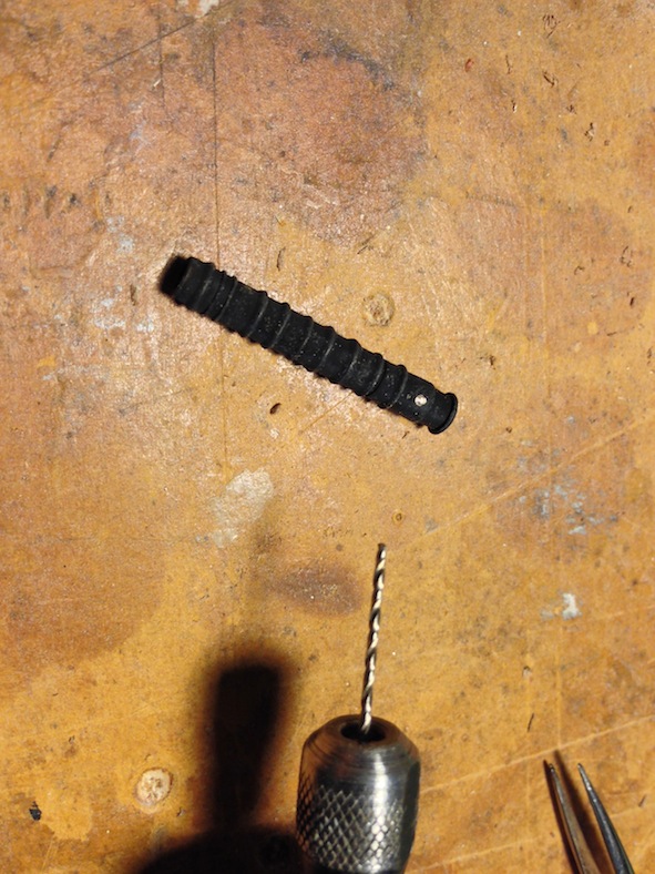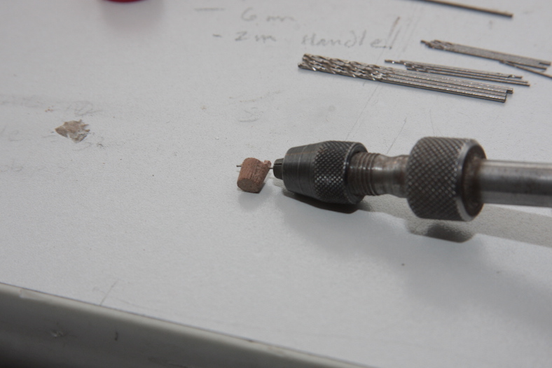 The spout of the pump is a 2mm dowel of walnut with the end drilled out hollow first with a 1mm hand bit, then with a 1mm etching bit for a dremel at low speed.