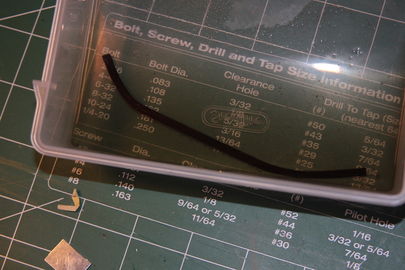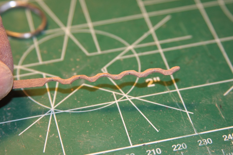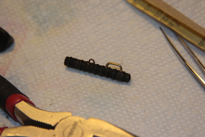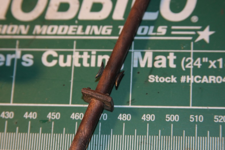 The pump mechanism and the strips around the pump are made from a scrap brass dowel and scrap brass flattened pieces. I flatten the end of the brass dowel out by putting it between the flat areas of a pair of pliers and striking it with a hammer.
