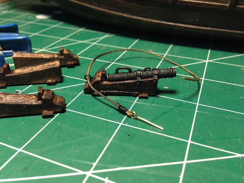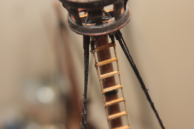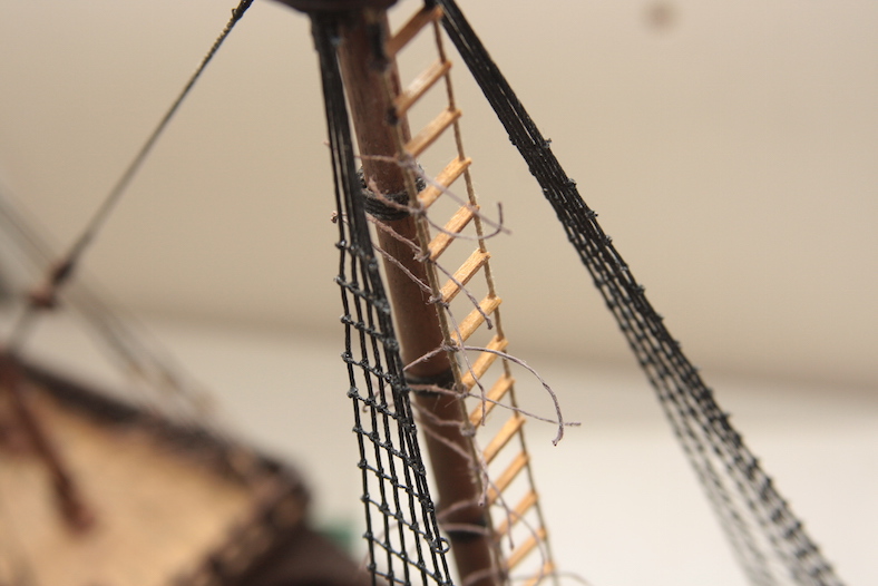 Although this was actually unbeknownst to me, apparently Naos of the time often included a rope ladder running the length of the mainmast. Like most folks, I just assumed sailors ran up and down the ratlines as often depicted in moves, etc. However, since this rope ladder was well documented in several places (including Pastor’s reference), I went ahead and put one together.