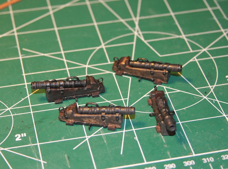The rigging of the bombards is very basic and was relatively easy to accomplish. However, it drives me crazy when the ropes and rigging stick up further than they need to. This is a natural byproduct of using tiny little string instead of actual heavy rope that would lie naturally. So I used a couple small dabs of CA glue and tried to position the rigging to look as though it has fallen naturally to the deck and along the bombard base.