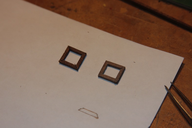 Since I always have difficulty creating frames this small, I used a technique similar to when I created the pieces for the captain’s cabin. After pre-staining the wood, I cut and glued the 2mm x 2mm strips to a piece of paper. This makes it MUCH easier to eventually mount to the gunports.