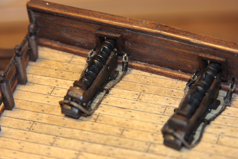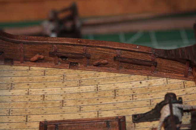 The bulwark rails are simple features created with 2mm x 2mm strips of walnut secured with mounting brackets also made of walnut. Like the cleats, these rails must withstand rigging knots, and so are also secured to stanchions or bulwarks with metal pins.