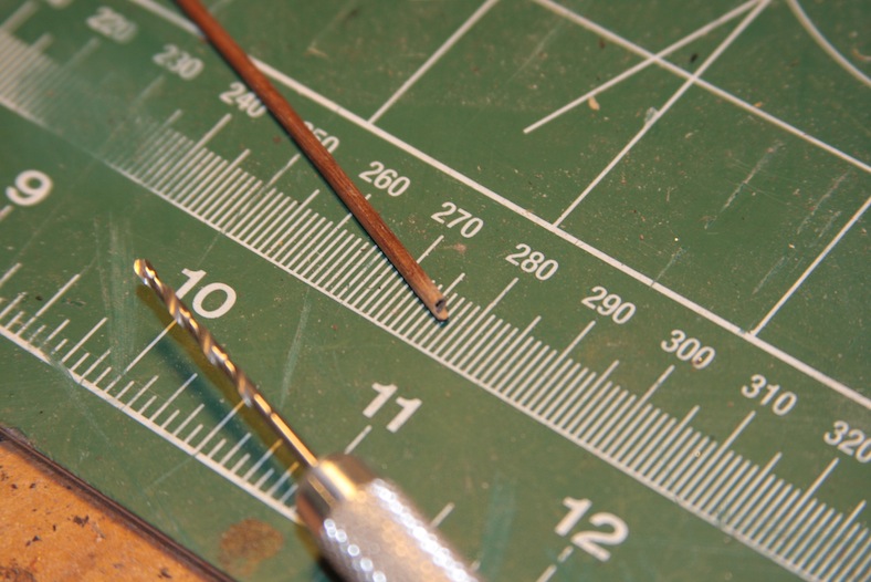 After the masts are built, the touchy part comes into play. Holes must be drilled into the decks. Obviously this is an awfully nerve-wracking step. Any mistakes here are nearly irreparable and would be very difficult to mask. Each hole is initially drilled with a very small bit at a very high speed to minimize tearing the delicate wood of the deck. The holes are widened incrementally using larger bits until it gets close to the desired diameter. The holes are then finalized with a high grit sand paper to achieve as tight a fit as possible.