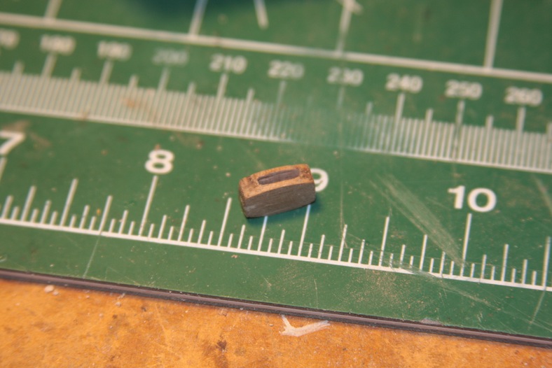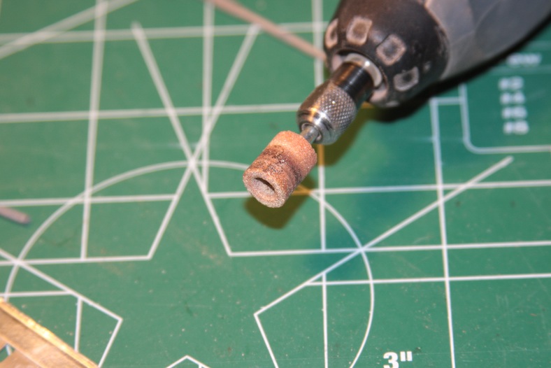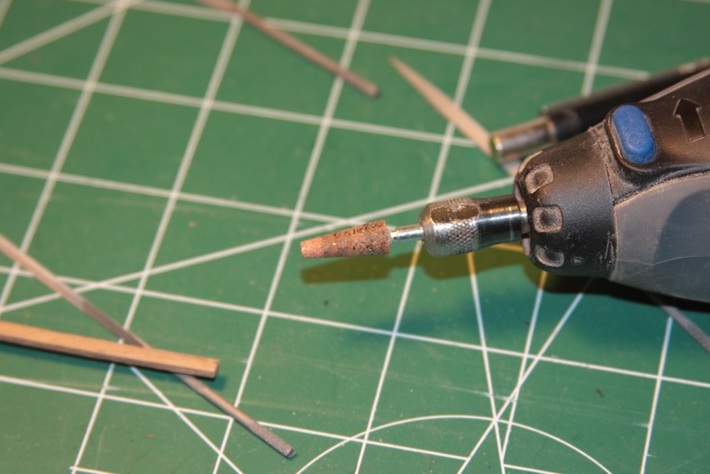 I briefly considered ordering cleats from one of the supply companies that I use, but decided I would be better served making my own. At any rate, I used a very similar process starting with a 3mm X 2mm strip, measuring off every 10mm for the width of the cleat I needed. I used a 10mm Dremel grinder for the bottom of the cleat and a 3mm to 7mm conical shaped grinder for the top.