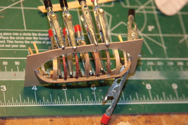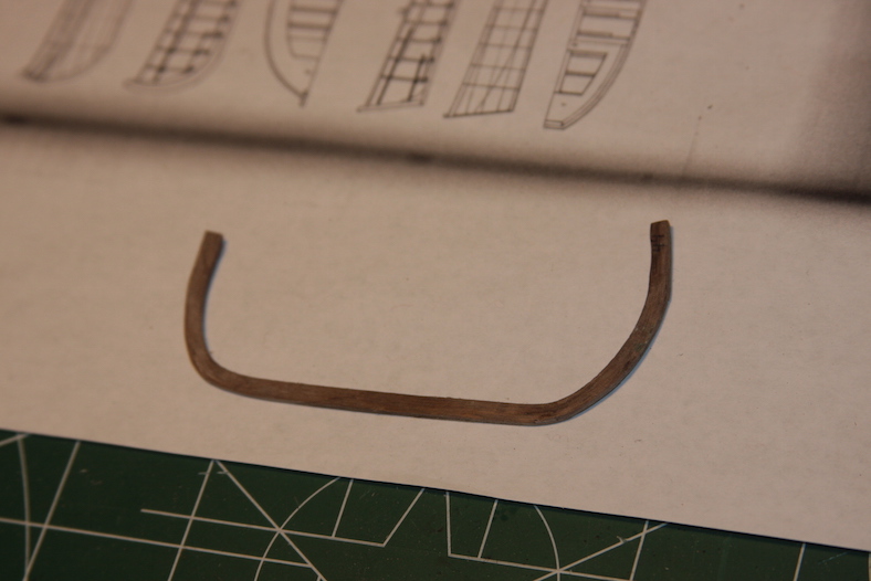 The most difficult part of this small build was shaping the keel. It’s a very dramatic bend. It took several attempts at soaking a strip then bending it with heat to get the shape I needed. I overbent, cracked and broke a number of pieces going to fast. Patience was definitely and ultimately a virtue here. But, I finally got a reasonable facsimile to work with.