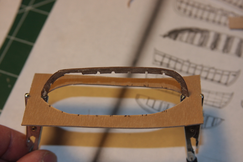 Shifting gears – I switched to a more basic method, trying to simulate the real-world version of building smaller craft. I mounted my bent keel, filed small grooves, then bent and shaped until I came up with something suitable to plank. While this ultimately worked – it was quite difficult soaking and bending these smaller pieces.