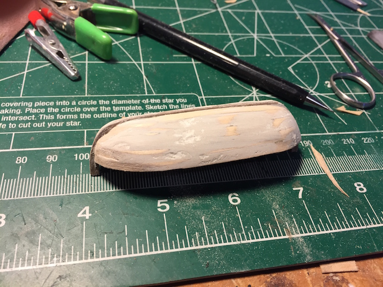 The barrels are very similar. Trimmed off of 8mm dowel scrap pieces, they are tapered on each end. The tops and bottoms are very slightly hollowed out using the same dremel bit as above, then sliced with the X-acto knife. The metal wraps are actually electrician tape – which is a great thickness, and also pretty easy to manipulate. It’s a technique I was happy with when I created the San Juan.
