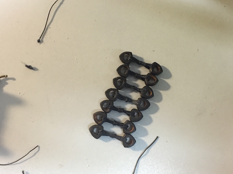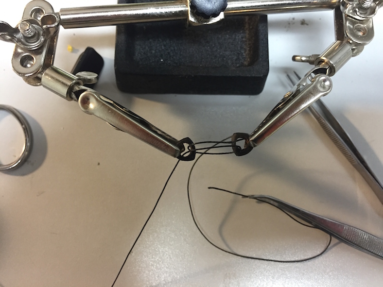 Step two is to rig the deadeyes. I used my handy soldering clamp to keep the distance between the deadeyes consistent. The process is a bit dodgy, since each time you tighten the ropes, the deadeyes have a tendency to squeeze together closer regardless of how tight the clamps are. This is less likely in the newer, three holed deadeyes.
