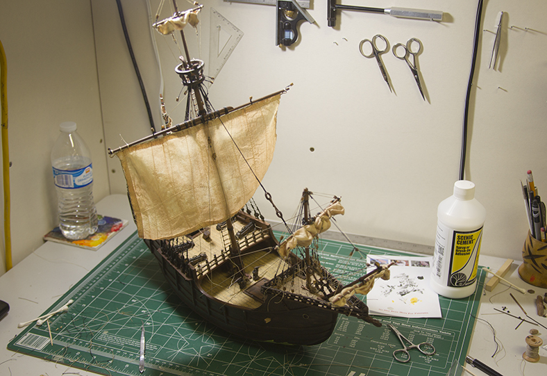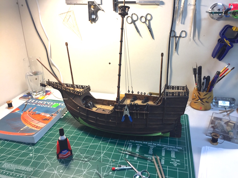 The shrouds are attached to the deadeyes by looping around the block an seized at the top. This allows for varying tension on the shrouds based on wind and sailing conditions. The fitting of the ratlines to the shrouds (known as rattling down) is one of the most tedious tasks of the build. Although there are quite a bit fewer ratlines in older ships such as the Santa Maria, there are still about 450 individual knots in both shrouds.