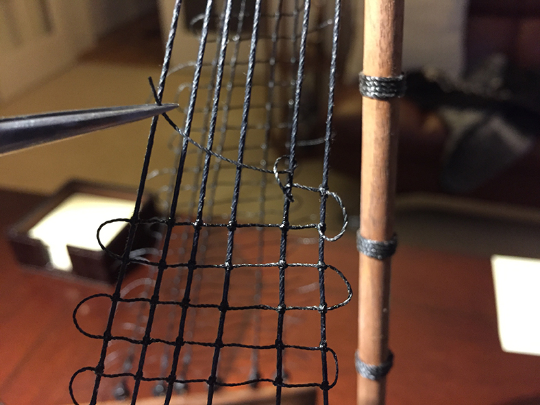 Each knot is a clove hitch, which provides some flexibility but maintains its tension when pulled. Each knot must be tied with the same level of care to maintain the symmetry of the ratlines – as once again, the ratlines are one the most visible aspects of the model an any flaws are more noticeable than other aspects of the ship.