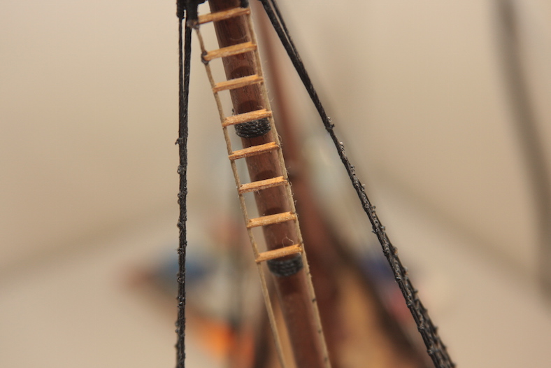 A pretty straightforward element, sides of the ladder were tied off to the mast and deck using typical techniques of wrapping and tying the ends. The steps were cut from 2mm strips then notched on the ends. They were tied to the ropes using what are essential clove hitch knots.