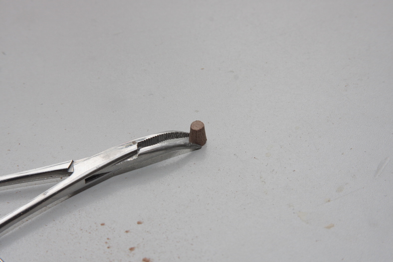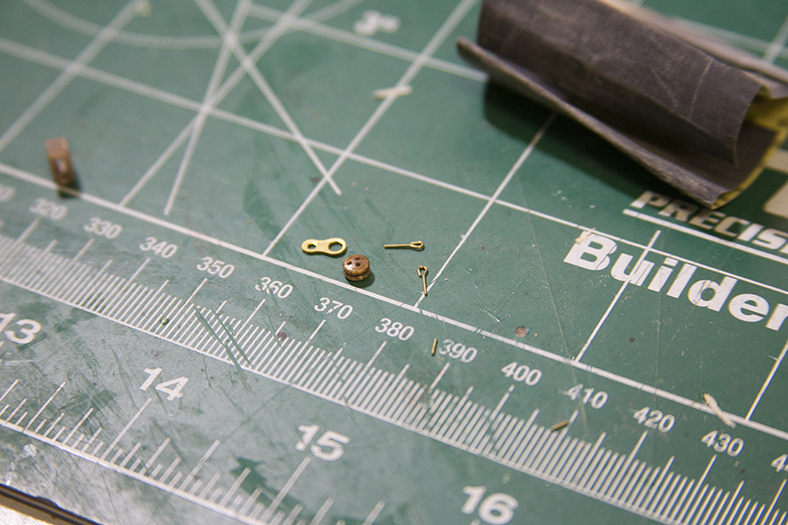 So, step one was to drill out the triangular deadeyes and open them up. Always a delicate process, I held the deadeyes steady with suture clamps, then drilled them out with a dremel. Any drilling is always followed up with some soft sanding.