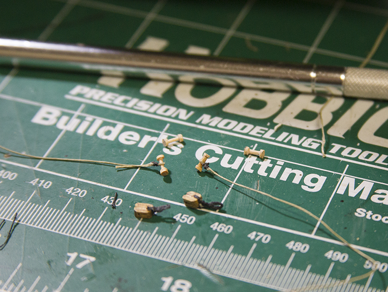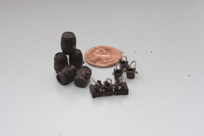 Similarly, I created a little assembly line for the buckets and barrels. The buckets are trimmed from 5mm diameter dowel pieces that are leftover scrap. The ends are sanded down and slightly tapered, then sliced down the sides with an X-acto knife to simulate “strips” of wood.