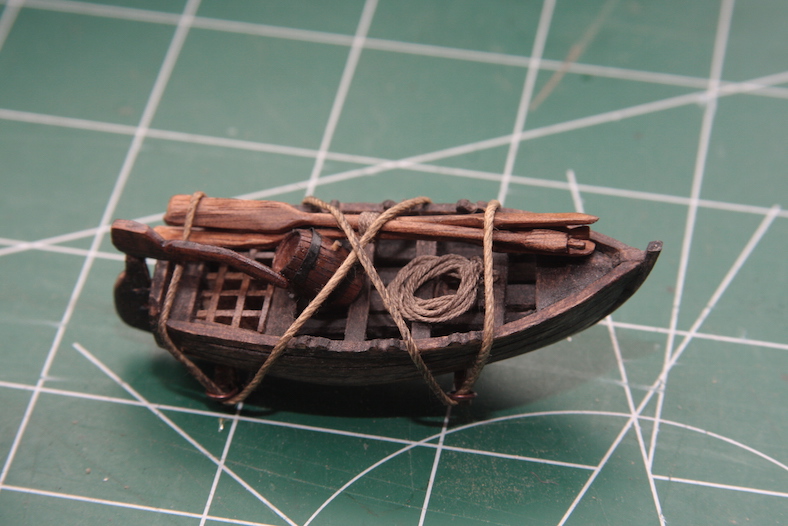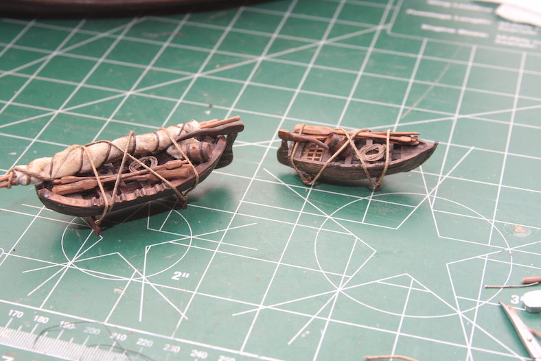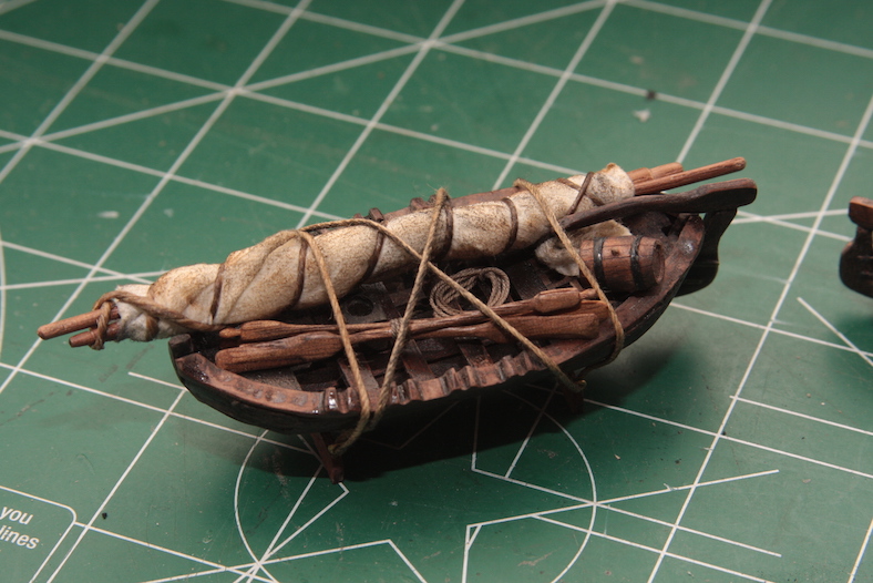 The little pieces are all dumped into the launches and tied off. I also threw in a couple coils of rope. The larger launch contains it’s own small mast and sail. This is just a scrap of material wrapped and tied to a 3mm dowel.