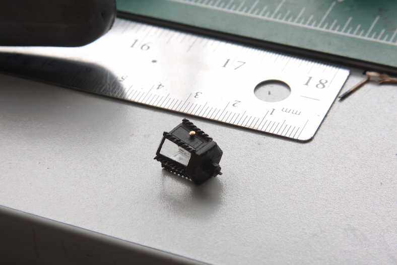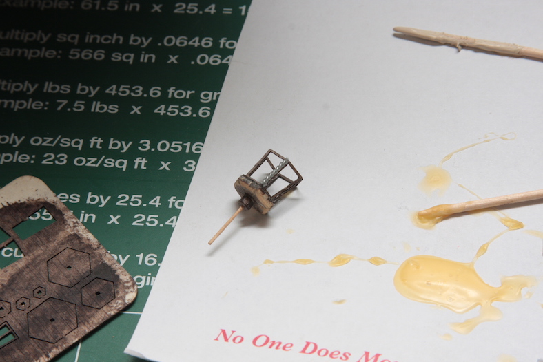 I put the basic pieces together following Chuck’s directions, then started the modification process. I based my idea on some of the Russian ship builder’s I’ve seen who are fantastic and creating miniature pieces. I used thin wire and wrapped two pieces together to create a “roped” look for columns. I then filed down and flattened one side so it’s easier to glue them to the corners of the lantern.