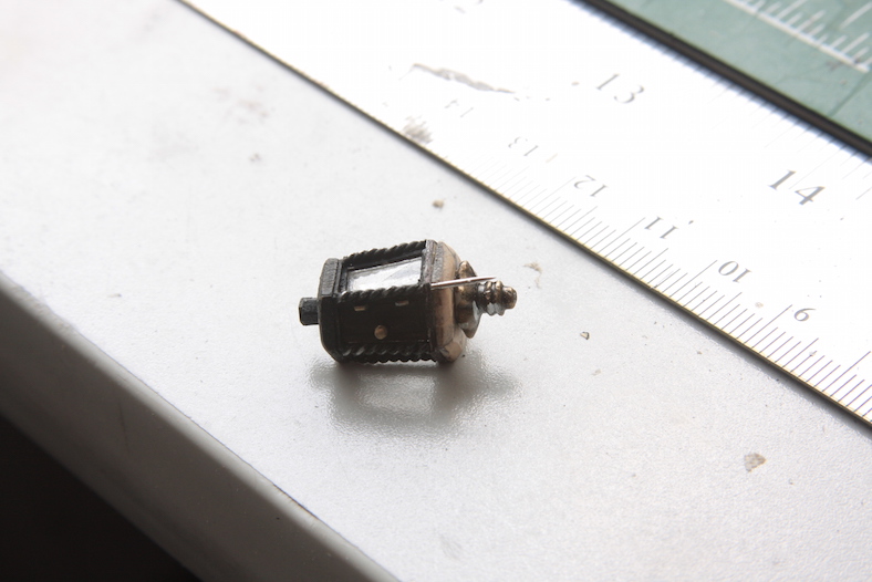 I pinned and rubbed the lantern black and used parts of brass nails to create the door handle and simulated hinges. I then chopped off the ends of straight pins and mounted them on the top of the lamp to create pointed “spires” that extend above the lamp.