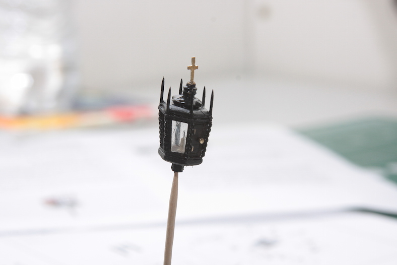 Finally, I took a 3mm wide brass strip and filed it to create a cross for the top of the lamp. I mounted the lantern using a brass dowel and finished the mount to the ship itself with a walnut base.