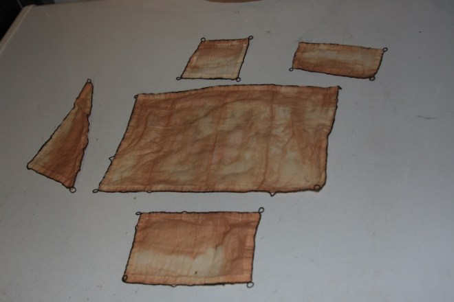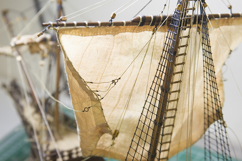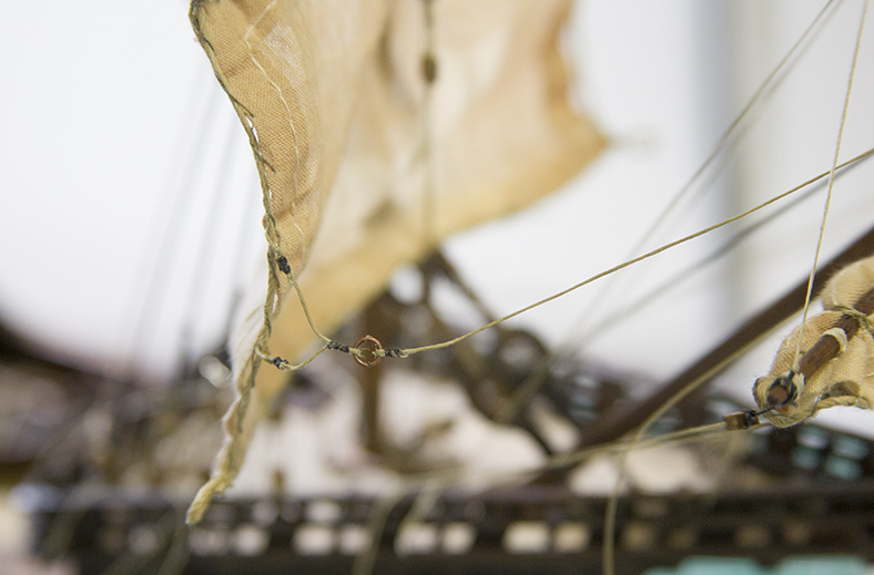 Prior to starting the running rigging, I stained the sails to give them an aged look. To achieve this look, I soaked them in tea over night.