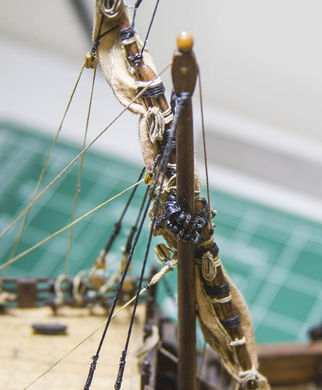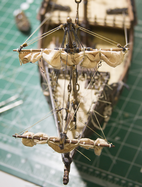 After rigging the topsail, and being able to adequately compare the look of the main sail down and furled, I decided to stick with my original plan. This was also influenced by the opinion of my lovely wife who also preferred the look of the ship with the sails furled.