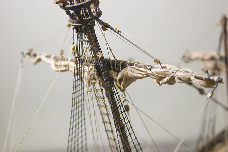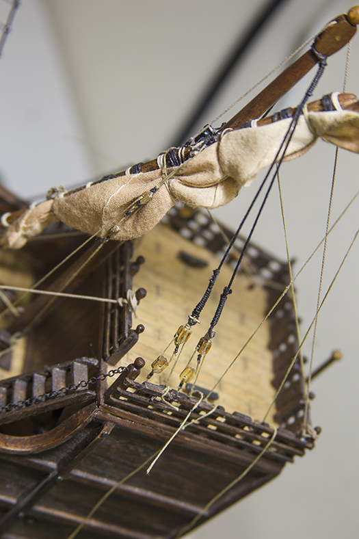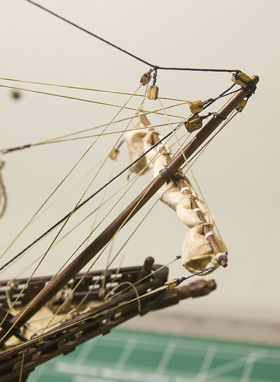 It’s also important to note that this is the first build where I’ve chosen to rig the sails “furled” – wrapped up onto the yard and unused. I felt that the only way to achieve the proper and accurate look of this was to rig them down, then actually use the rigging to raise them and furl them afterward. I think that gives me a good idea of how they would have appeared when raised by sailors while underway.