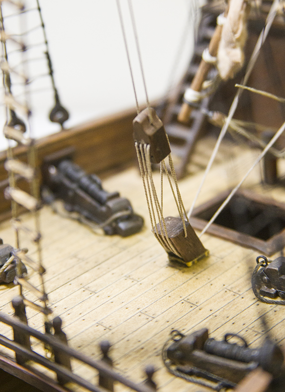 The purpose of the shrouds is to provide masts with lateral support. As a relatively small ship, the Santa Maria most likely had six pair of shrouds on the main masts that were then secured to the channels using deadeye blocks. The shrouds and ratlines are often the most recognizable and visible part of a ship and model. Throughout history the image of sailors or pilots climbing up and down ratlines are forever immortalized in movies and our imaginations.