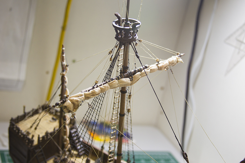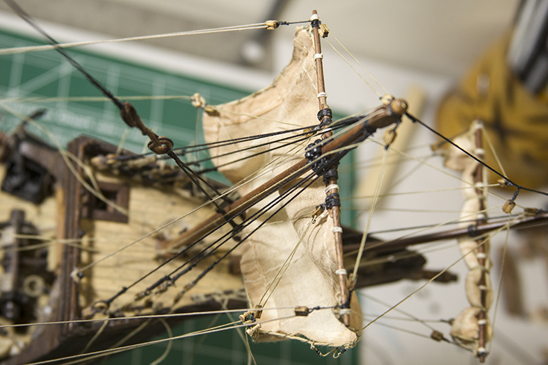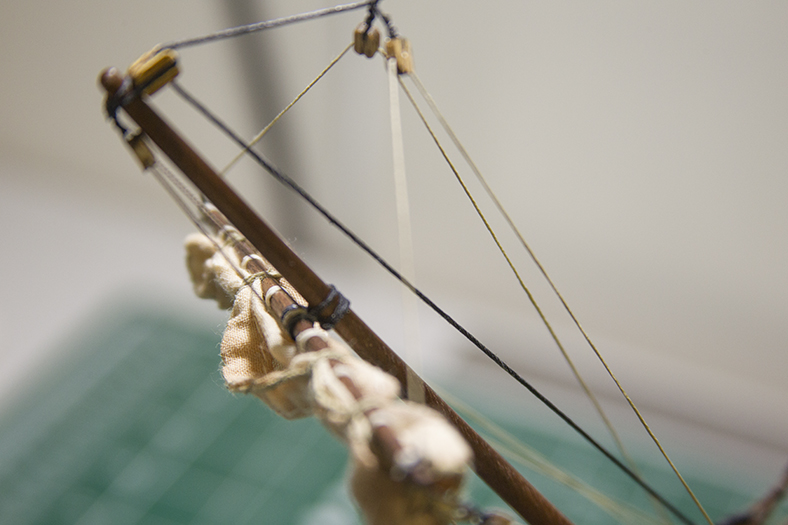 The top of the mizzen yard is attached to the main mast with a rig called the “lift”. The bottom is attached to the the deck of the ship at a couple of different points with “tacks” – in my case it is attached the rear rail. The mizzen is unique because of the angle in which it is attached to the mast, as well as how it’s used. It is essentially part of the ship’s “steering system” and aids the ship when guiding the wind.