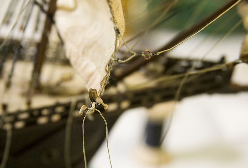 Running the rigging is one of the most tedious yet fun aspects of a model for me. It represents a turning point in the process when you are closer to the end of the build than the beginning. Although there are certain “rules” with regard to running the rigging, there really isn’t a specific order. Regardless of which masts or sails you start with, there’s always a lot of running lines through and around one another.
