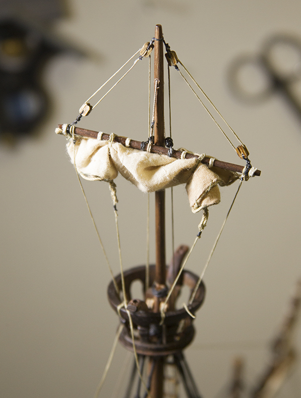 I decided to wait until after I rigged the topsail before making my final decision. The topsail (the yard and sail above the crow’s nest) is the easiest and least complicated to rig. The parrel is a basic strip attached to the yard, then run through a sheave in the mast itself. The sheave is created by VERY carefully drilling out the mast, then cutting off a thin dowel.