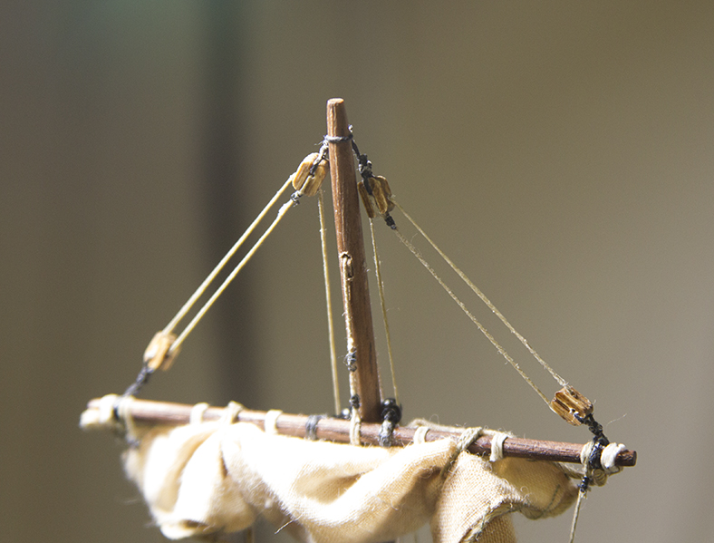 The tacks (running to the fore) and the sheets (running to the aft) were attached to the cringles (corner of the sail) using toggles. There is some contradiction in Pastor’s book whether they were attached using blocks or toggles – but as I liked the look of the toggles and wanted to remain consistent, I went with them.
