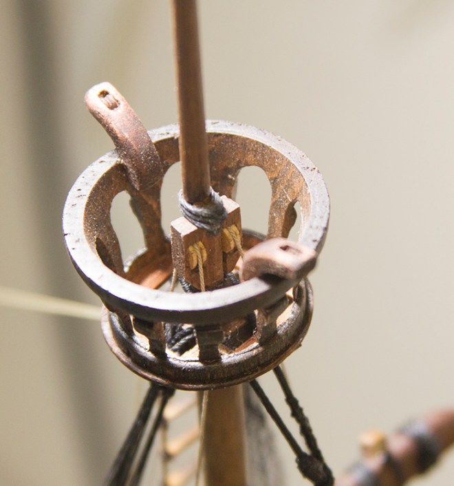 The rig goes through the sheave then runs down through the crow’s nest to the decking. Only two lifts attach the yard to the top of the mast with blocks, then run to eyelets inside the crow’s nest.
